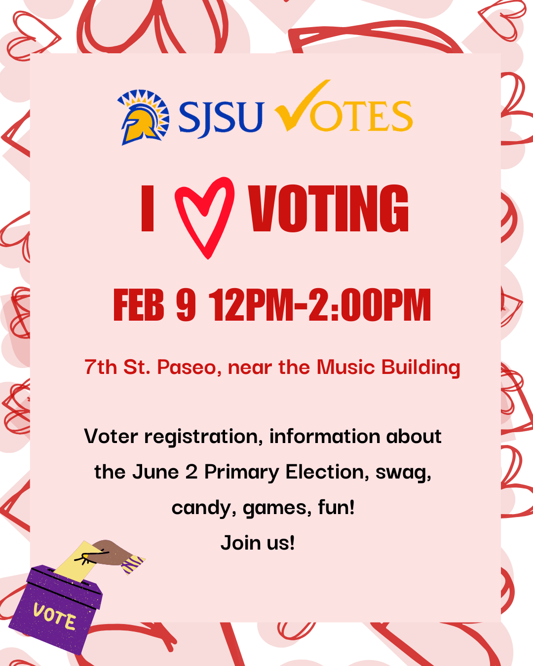 Join SJSU Votes for I Heart Voting, a celebration of voting, on Monday, February 9, 2026 12:00pm-2:00pm on the 7th St Plaza!