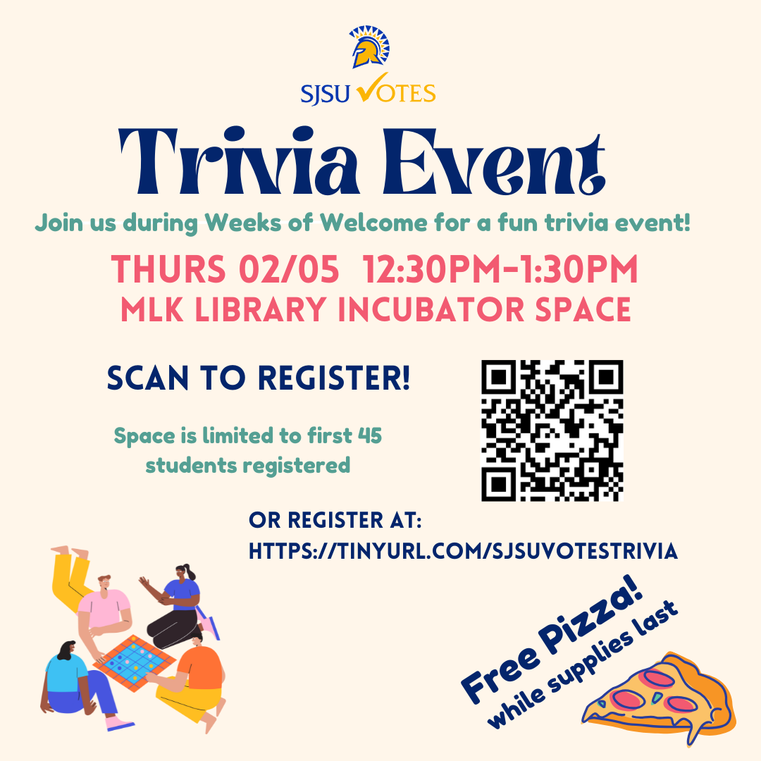 Join SJSU Votes and the Institute for Public Affairs and Civic Engagement for Trivia Night on March 5th 6-7pm via Zoom. This event is open to all San José State students, faculty and staff.
